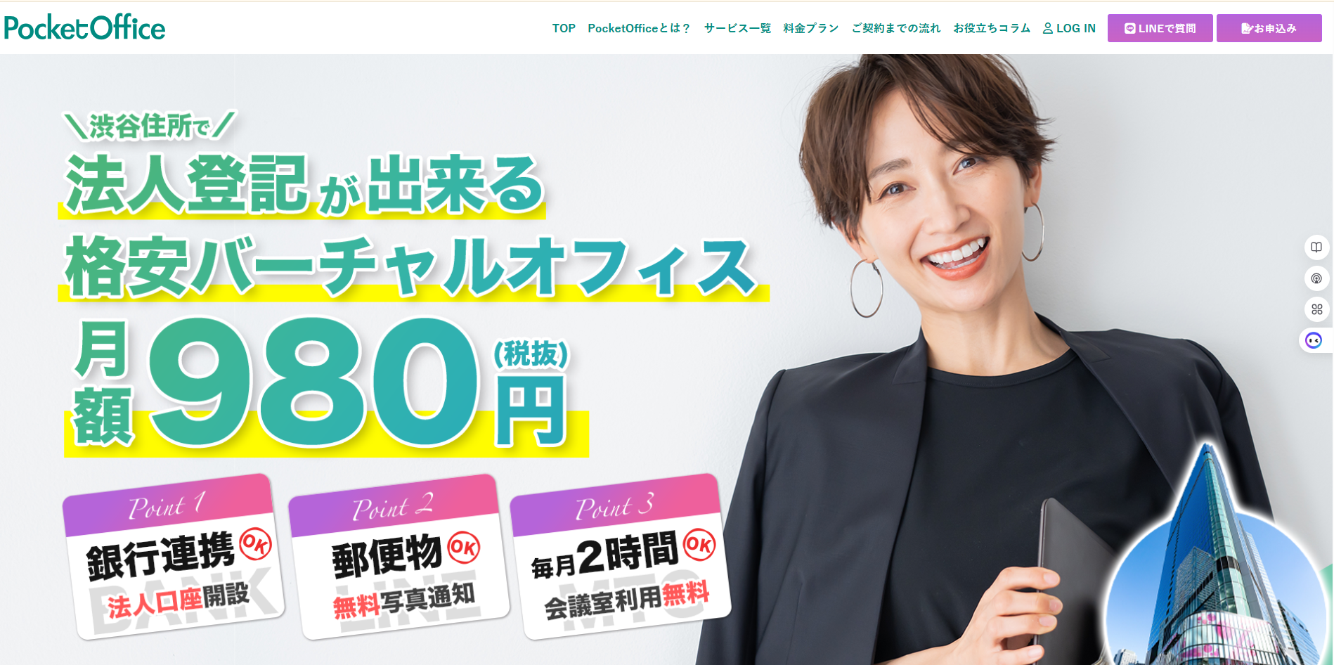 コストをおさえて事業用の住所をレンタル出来る画期的なサービスとして近年注目されているサブスクリプションサービスです。PocketOffice(ポケットオフィス)は「東京渋谷住所」「郵便物転送」「03番号/050電話転送」「ホームページ運用」「補助金助成金受給支援」等、現代ビジネスに必要なものを全て業界最安値水準でご利用出来る創業支援プラットフォームです。